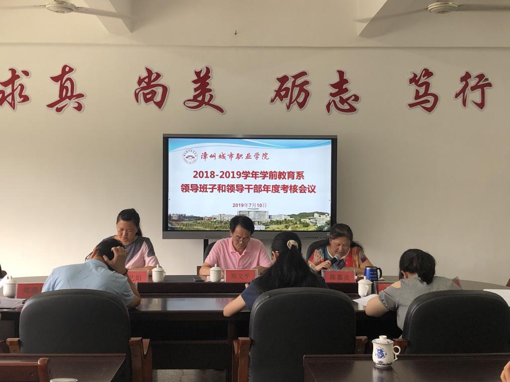 2019年7月10日下午,学前教育系在系会议室召开2018-2019学年领导班子和领导干部年度考核会议。会议由考核小组组长郑文平副院长主持,学前教育系书记陈慕贞、系副书记蔡艺娟、考核小组成员郑燕平、姚静峰以及我系全体教职工参加会议。