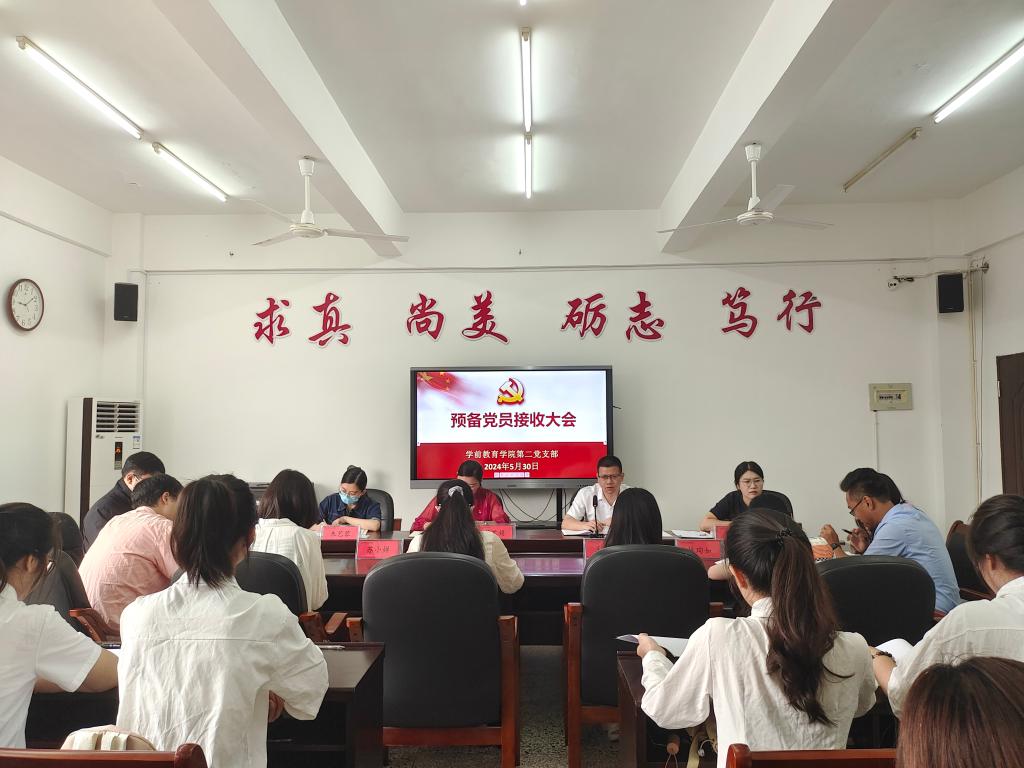 为做好预备党员的培养和考察工作,积极为党组织吸收新鲜血液。2024年5月30日,学前教育学院第二党支部在学院会议室召开了接收预备党员大会,讨论并决议是否接收刘月华等8名同志为预备党员。会议由党支部书记郑美江主持,全体入党培养联系人和8名发展对象参加了此次会议。