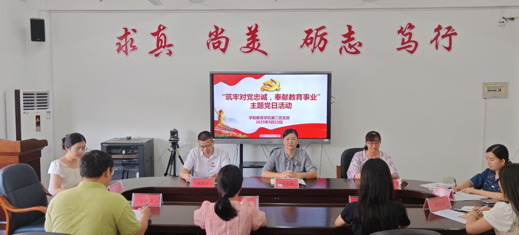 为进一步加强党员教师的党性修养,增强责任担当意识,凝聚团结奋进的力量,2025年9月15日,学前教育学院第二党支部开展“筑牢对党忠诚,奉献教育事业”主题党日活动。活动由支部书记郑美江主持,支部党员教师参加了本次活动。