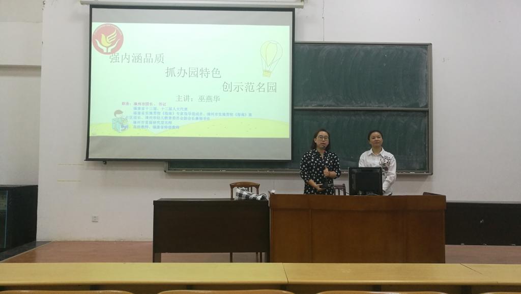 为了使学前教育系学生能够进一步了解幼儿园,为日后的实习以及就业有更深入的了解,我系特邀漳州市幼儿园园长、书记、特级教师巫燕华老师于4月11日晚19:00在怀仁楼梯教四开展讲座,此次讲座以“强内涵品质,抓办园特色,创示范名园”为主题,向同学们全方位地剖析幼儿园的各类问题,本场讲座由我系艺术与实践教研室主任索丽珍老师主持。
